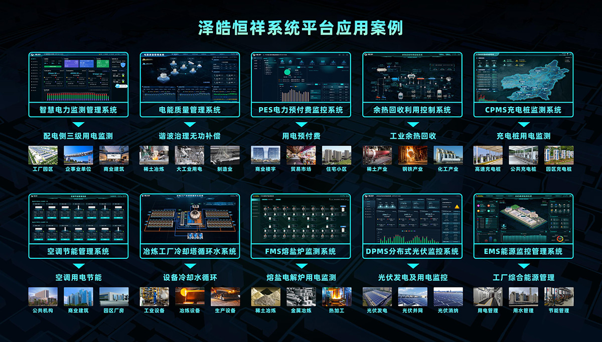 智慧电力监测系统、电力预付费监控系统、分布式光伏监测系统、熔炼炉监测系统、电能质量管理系统、充电桩监测系统等